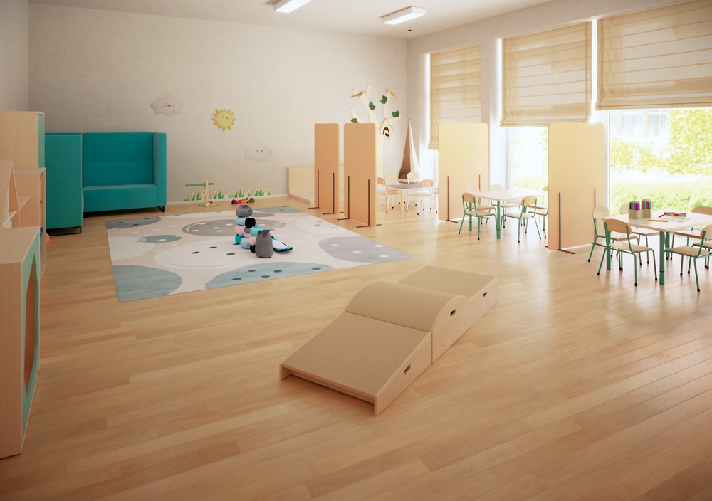 Panele akustyczne i elementy sensoryczne użyte do tej aranżacji dzielą przestrzeń na strefy. Oddzielają miejsce spokojnej nauki od strefy zabawy. Dzięki czemu ograniczony zostaje nadmiar bodźców.
